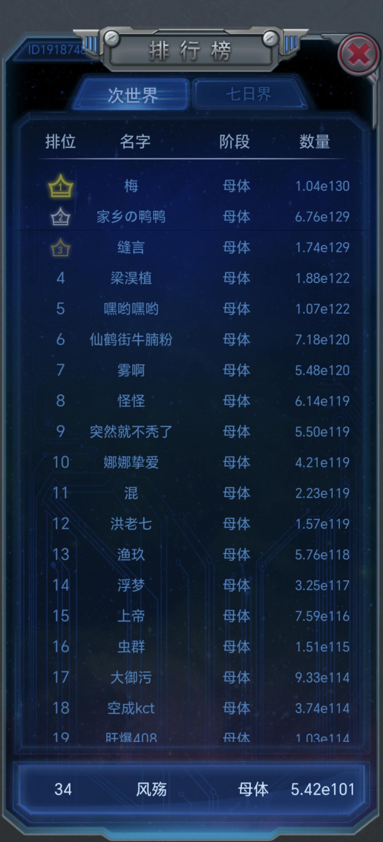 8月中旬开始玩的吧,自己瞎玩了一个月后看到论坛里面居然有这么多大佬攻略,就浅学了一下,严格按照扭曲复制期来玩,果然爽了很多(尤其是复制前期简直是打开新大陆)现在好像要接着冲暗物质……不过现在也不急了,开始养老了()