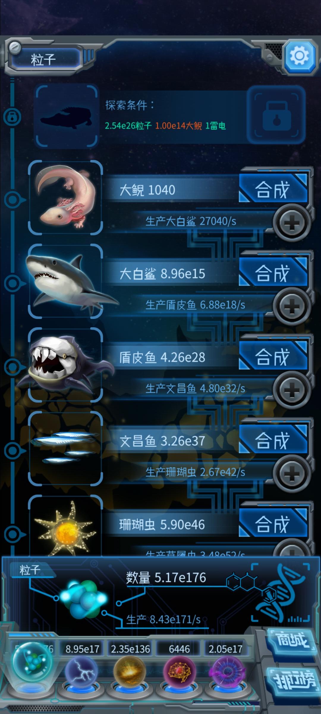 最近我才解锁大白鲨,今天才用一百大白鲨给盾皮鱼升级了,一看排行榜,第一百名的物种从昨天的7个大白鲨变成盾皮鱼了,我也从108到103了,啧啧啧