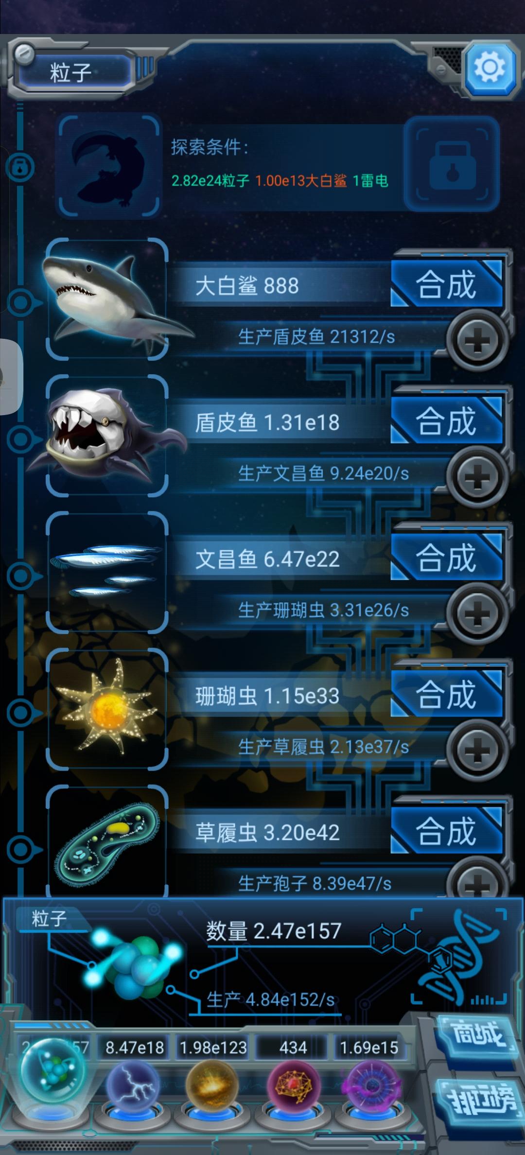 最近我才解锁大白鲨,今天才用一百大白鲨给盾皮鱼升级了,一看排行榜,第一百名的物种从昨天的7个大白鲨变成盾皮鱼了,我也从108到103了,啧啧啧