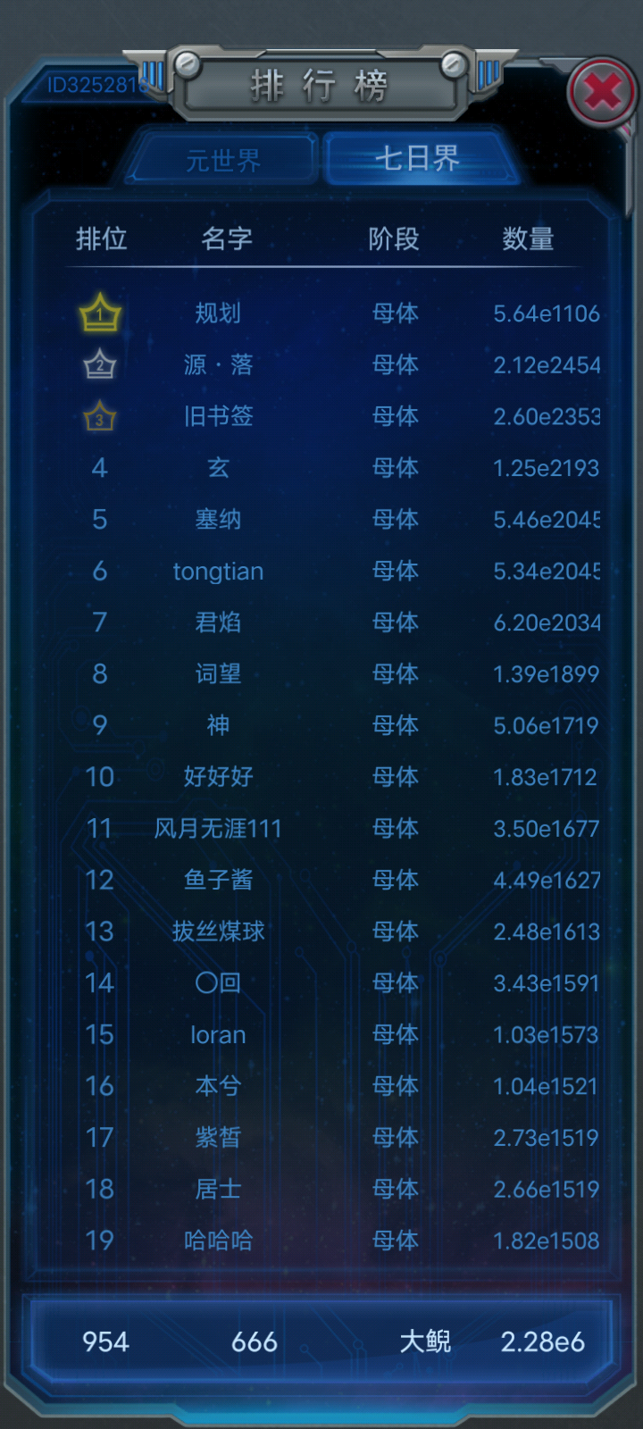 第一个是游戏bug,第二名的母体数一名高1348个数量级。第二个是卫星五精炼所需要的粒子数除以10^186之后就是《物种起源》中我的昵称