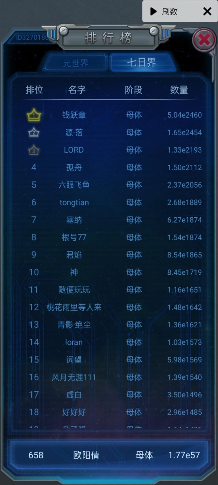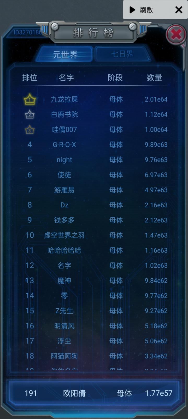 众所周知,最高级物种能达到草履虫的玩家能进入元世界前一千名(我截图的时间不一样,越低级的物种截的时间越早,现实可能会跟理论有偏差),前一千人中最高级物种能达到草履虫,珊瑚虫,文昌鱼,盾皮鱼,大白鲨的玩家占了元世界前一千人中的一大半(可能是600人左右,可能会不准确),由于雷电产量的过大幅度的提升,复制期开始缩短,产生了爆发期的萌芽。所以最高级物种能达到大鲵,巨鳄,甲龙,始暴龙,霸王龙,生化兽,机甲
