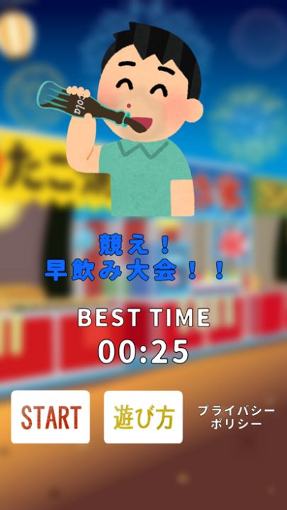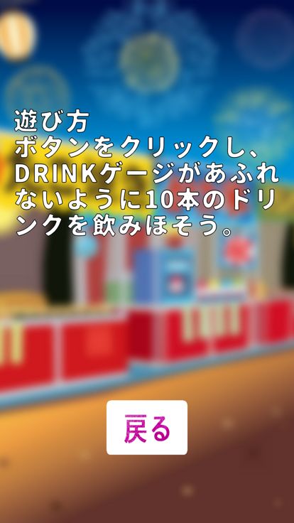 画面のドリンクボタンをクリックし、牛乳→コーラ→黒酢の順で早飲みのタイムを競う簡単ゲーム!