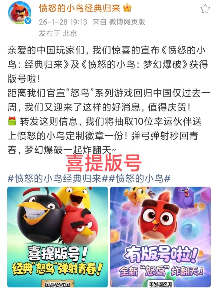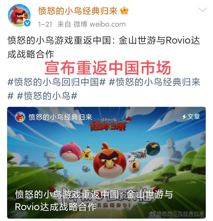 1月28号,“愤怒的小鸟”官博发文宣布,《愤怒的小鸟:经典归来》及《愤怒的小鸟:梦幻爆破》喜提版号❗❗❗就在一周前,他们才刚官宣与金山世游建立战略合作伙伴关系,《愤怒的小鸟》系列游戏将回归中国市场。这一次的喜提版号,仿佛像是提前知道了一般,很是巧合。也不知道会是否影响到他们的游戏上线排期计划。个人感觉本土化翻译应该是没那么快能完成的,尽管游戏是现成的,拿过来就能用。而且,游戏上