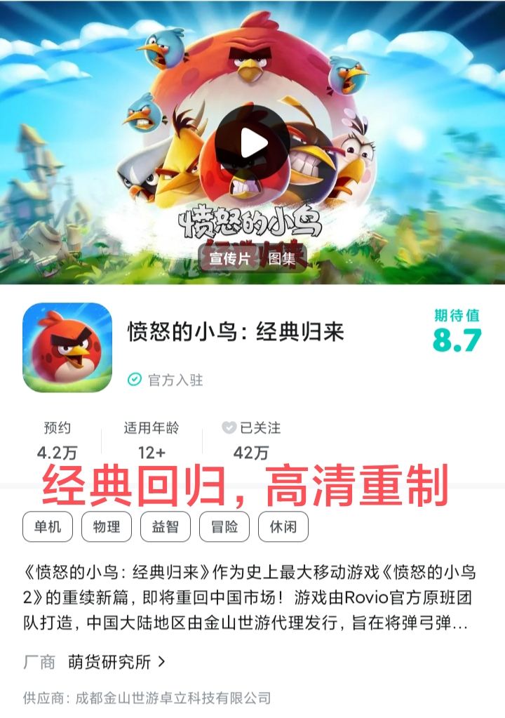 1月21日,《愤怒的小鸟 经典归来》发文称,金山世游与Rovio已建立战略合作伙伴关系,《愤怒的小鸟》系列游戏将回归中国市场🔥🔥🔥据悉,该系列游戏将由金山世游独家发行并运营。曾经火爆大江南北的《愤怒的小鸟》,是Rovio在2009年开发并发行,全球下载量已突破50亿次。之前因为版号问题、运营策论失误等问题于2023年逐渐退出中国市场。这一次它重返中国市场,将推出两款核心作品。一