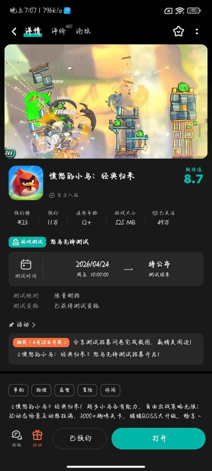 亲爱的各位玩家:欢迎关注并参与怒鸟先锋测试!预告一下:怒鸟先锋测试明天(4月24日10:00)就要开服啦!为了让大家一路丝滑闯关,我们提前整理了超全Q&A常见问题解答,有其他问题欢迎在官方渠道提问。明天准时上线,一起弹射出发,炸翻猪堡!Q1:怎样才能获取测试资格?A1:填写招募问卷即报名成功,官方将对问卷结果进行评估筛选,成功获得测试资格的玩家将通过TapTap站内信的形式通知,请您注意查