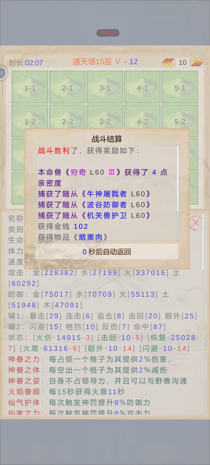 先说阵容,我目前主要转过鬼,转过仙,最后转了人,才能挂机打通通天塔30层。鬼,仙我都打不过。玩人族最重要有三点,第一个穷奇➕白泽,再来个胡半仙。第二个军团技能非常重要,所以要挂机玩需要带聚气符。军团技能选鼓舞➕恢复,这样就可以这两个军团技能轮番释放。第三个就是火阵免疫火伤。人族主要上来来自狂热信仰这个被动,阵容每次放一次军团技能,伤害➕26%左右。这样前面不死后面一刀流。最后蚊子很好用,主要是分担