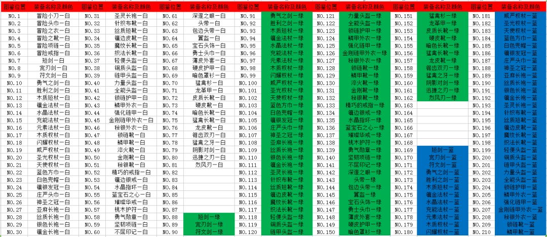 各位,好久不见,我又回来了,今天给大家带来了装备图鉴的位置详细说明哦,每个位置是什么都有说明哦😎 额外提醒一点哦: NO.82-87 NO.163-168 NO.244-249 NO.325-330 这几个位置是没有装备图鉴的 图鉴总共572个,集齐548个即为全图鉴达成哦! 话不多说,我们直接放图: 第一幅图:NO.1-NO.201 第二幅图:NO.211-NO.420 第三幅图:NO.421-