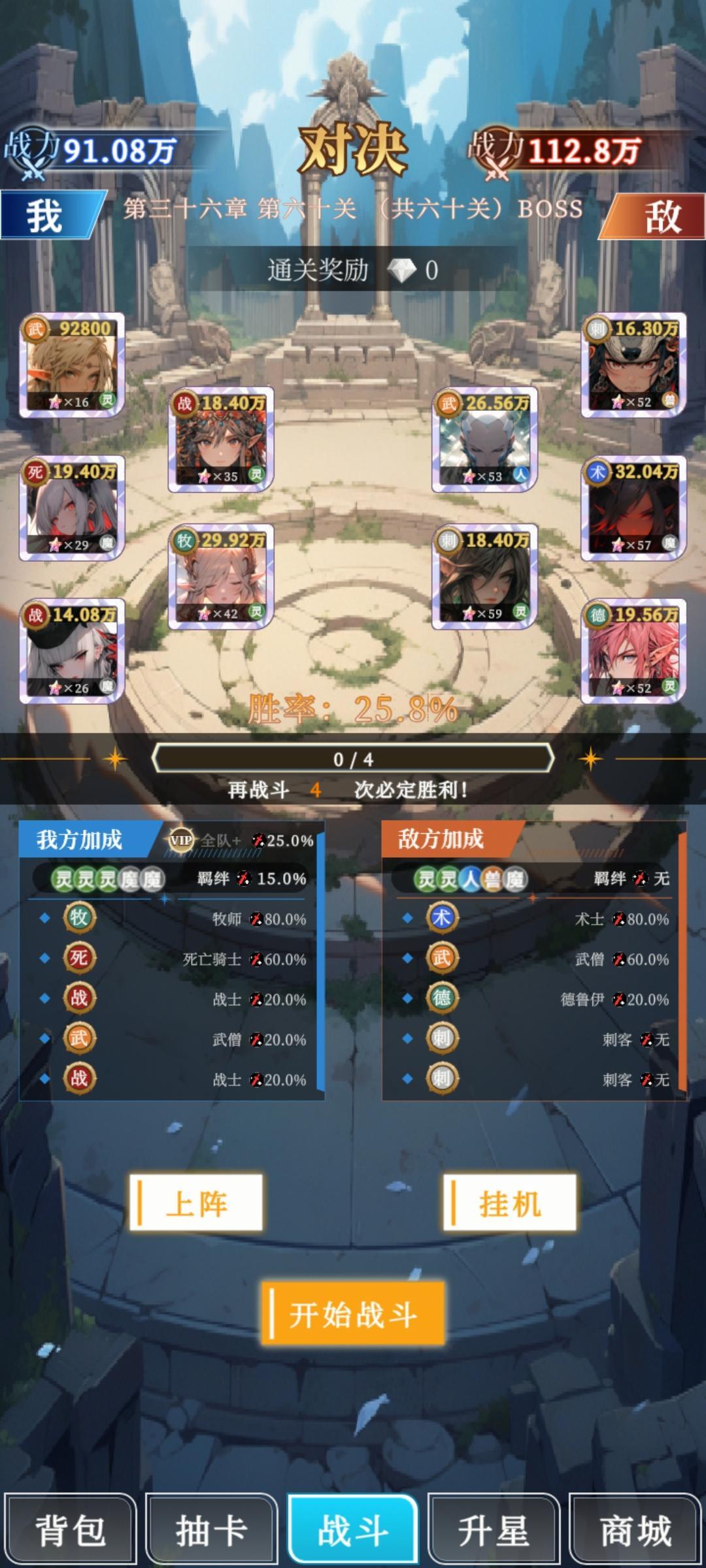 分享一下攻略: 玩法:氪金→抽卡→升星,没有打怪。 抽卡品阶分为:蓝色,紫色,金色 蓝色:只能卖了回收钻石继续抽 紫色:可以合成到金色1星,作为升星素材 金色:战力单位。 [表情_斜眼笑]然后,是合成攻略。 先5张同种族金卡,可以提升五星, 然后五张同名卡,再提升五星, 再5张同种族金卡,可以提升五星, 一直重复…… 所以,五张同种族金卡要用紫卡合成的,天然金卡留着当同名卡。 【升星过的卡不能当材