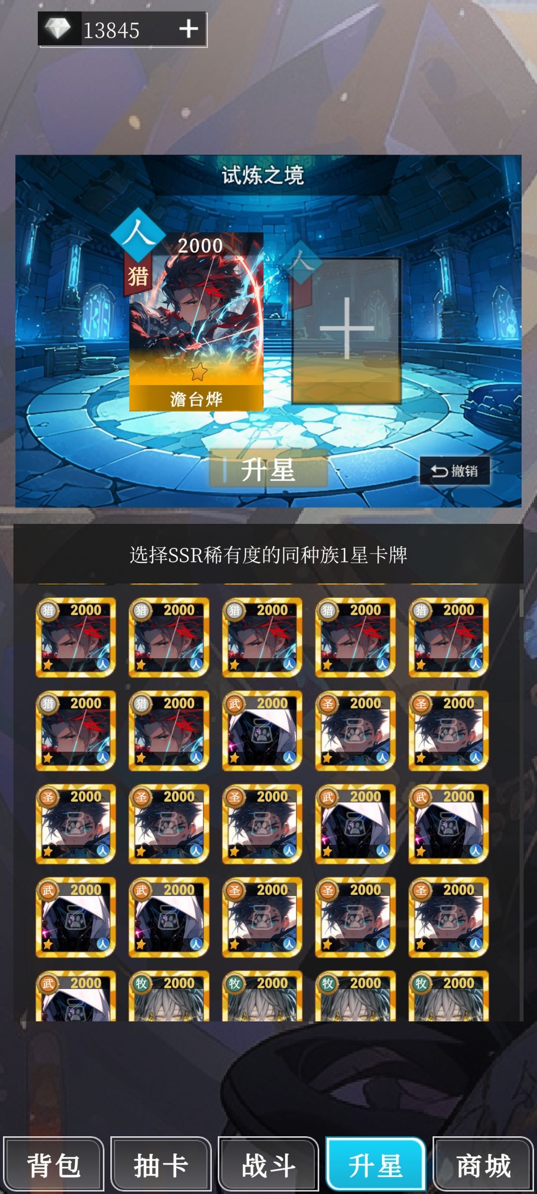 首先,sr的卡基本上没用,毕竟钻石多,抽卡也多,而且sr上限也低,升星只能升到SSR,和SSR卡刚抽到一样,只能给SSR当狗粮用。 其次SSR升星的时候,尽量用sr提升出来的狗粮,狗粮会有标识,而且到了一定的星级,就必须要用同名SSR卡。 最后,尽量不用SSR卡来提升其他SSR的星级(指不定什么时候数量就反超了,本游戏卡牌战力除了职业种族加成外就只有星级,没有等级)不过问题不大,有卡牌重置按钮,可
