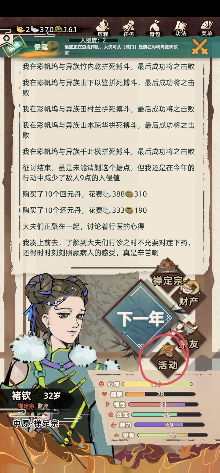 先提前说一点:这个方法适用于外敌刚入侵时玩家4岁及4岁以上(3岁也可以,就是有点困难),且玩家选择玩短刀(玩短刀的原因第三处有写),以及玩家上辈子在钱庄里留了高品阶武器和匹配武器的高品阶功法(金色的就可以,如果没有准备功法和武器那就去集市多囤一点药,虽然囤药大概率也不能成功)。 ①外敌入侵多少年会达到100入侵值? 先看P1,我这个档外敌入侵是0岁的时候,到12岁时入侵值就到了89。 我多次重启人
