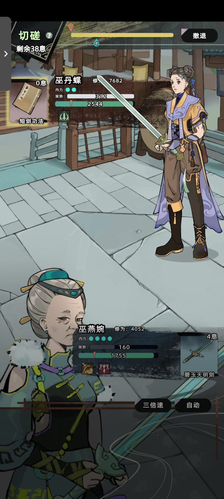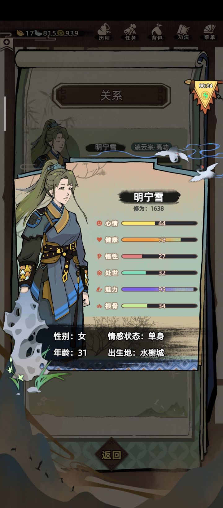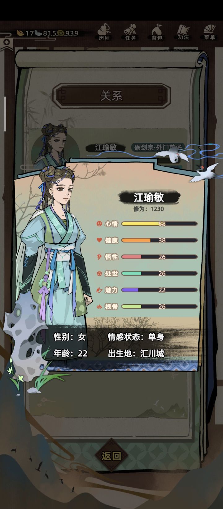 1. 开局一定要选女角色,优先看广告刷初始,魅力70以上,父母在当前门派内门弟子或以上。两个最好,一个也行。他们会很早升门派高层,指点你学功法。兄弟姐妹越多越好,切磋可以+功法熟练度。2. 入武馆,选剑,直接伤害高,期间多去听戏+根骨的,还有当地武馆打桩,加功法熟练度,悟性,根骨。根骨影响橙武器穿戴要求(60)。全套蓝色功法武器满了也差不多加门派了。3. 门派一定要选择碧波门,短刀。4. 橙