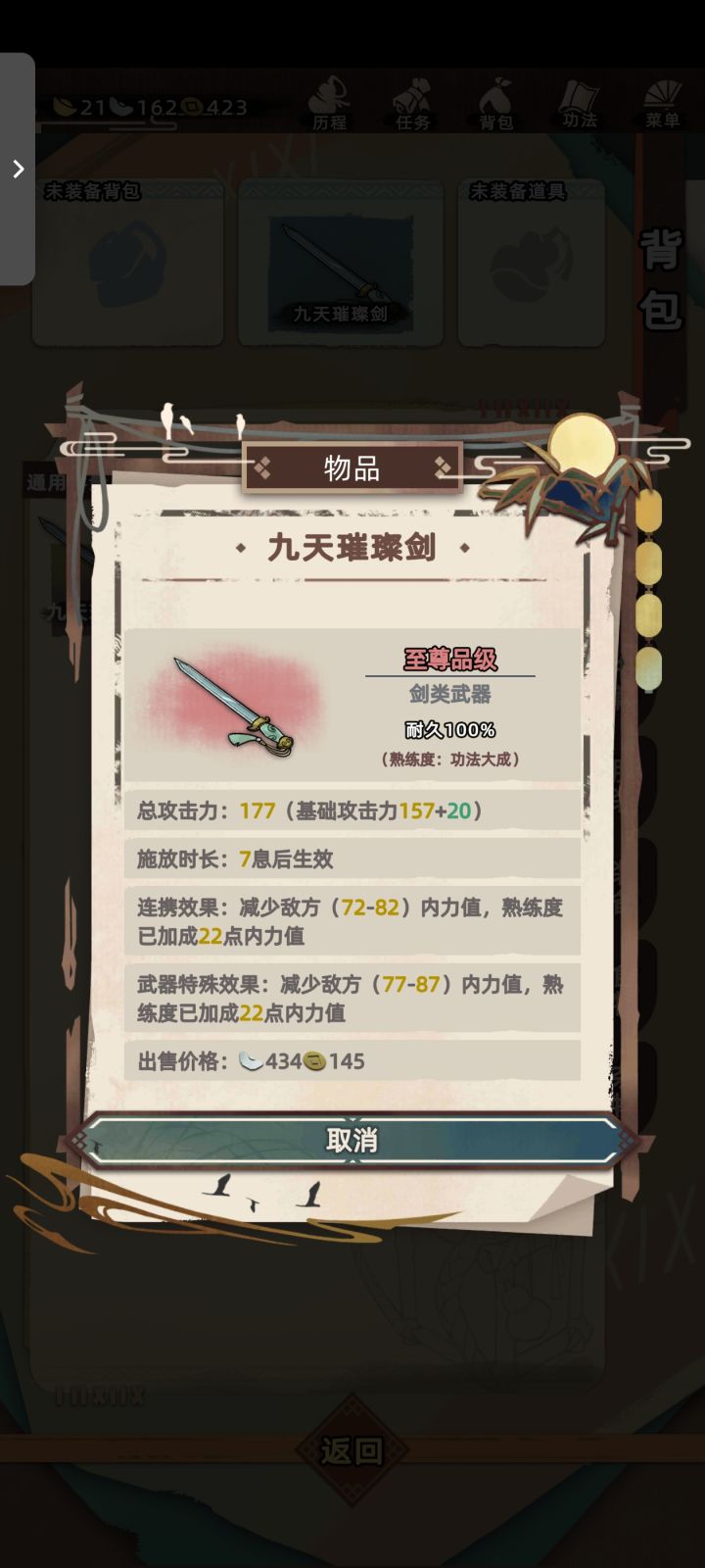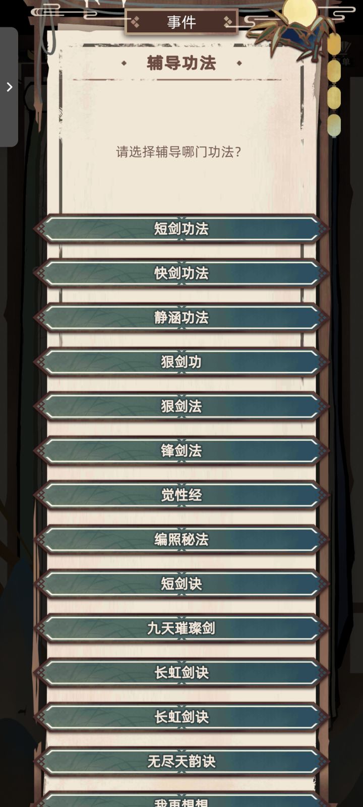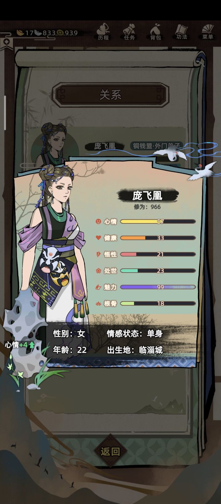 1. 开局一定要选女角色,优先看广告刷初始,魅力70以上,父母在当前门派内门弟子或以上。两个最好,一个也行。他们会很早升门派高层,指点你学功法。兄弟姐妹越多越好,切磋可以+功法熟练度。2. 入武馆,选剑,直接伤害高,期间多去听戏+根骨的,还有当地武馆打桩,加功法熟练度,悟性,根骨。根骨影响橙武器穿戴要求(60)。全套蓝色功法武器满了也差不多加门派了。3. 门派一定要选择碧波门,短刀。4. 橙