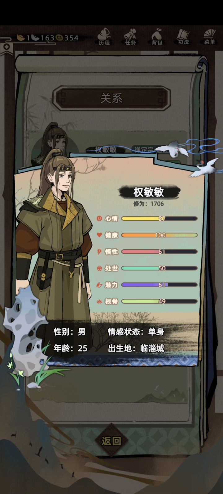1. 开局一定要选女角色,优先看广告刷初始,魅力70以上,父母在当前门派内门弟子或以上。两个最好,一个也行。他们会很早升门派高层,指点你学功法。兄弟姐妹越多越好,切磋可以+功法熟练度。2. 入武馆,选剑,直接伤害高,期间多去听戏+根骨的,还有当地武馆打桩,加功法熟练度,悟性,根骨。根骨影响橙武器穿戴要求(60)。全套蓝色功法武器满了也差不多加门派了。3. 门派一定要选择碧波门,短刀。4. 橙