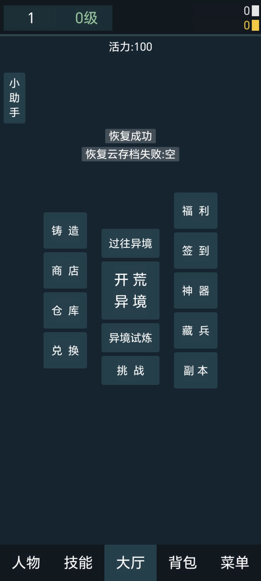 新手起步: 1. 进入游戏后会弹出小助手 取名 !(不能特殊字符) 2. 接着可以输入礼包码(全部礼包码后面写) 3. 商店买装备,穿上之后打开人物界面加点9级前可以全力量 4. 点开‘大厅’-‘开荒异境’ 进入‘新手境’ 一波怪打完之后就拥有一个异境了 5. 点开‘大厅’-‘异境试炼’先点‘挂机’(挂机在线离线都有收益,最长24小时),再点‘进入’ 就可以在拥有的异境里面打装备了! a) 注意