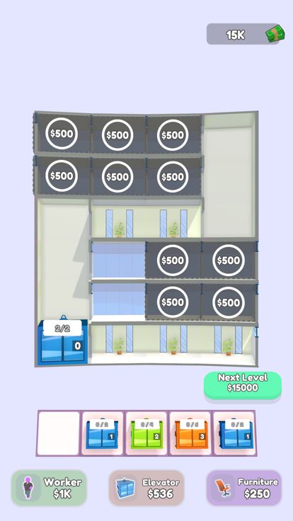 Build up your office and merge elvators to increase customer capacity to get rich!