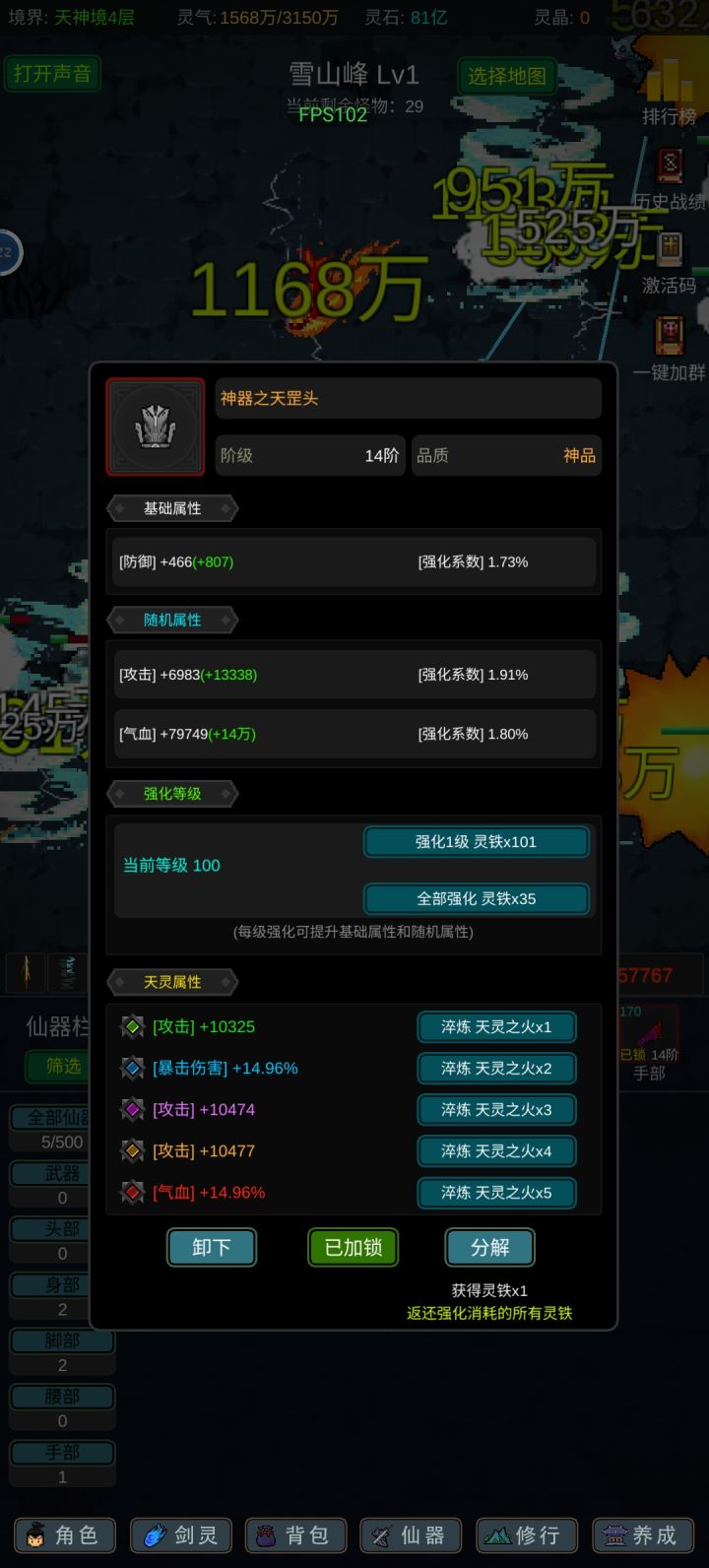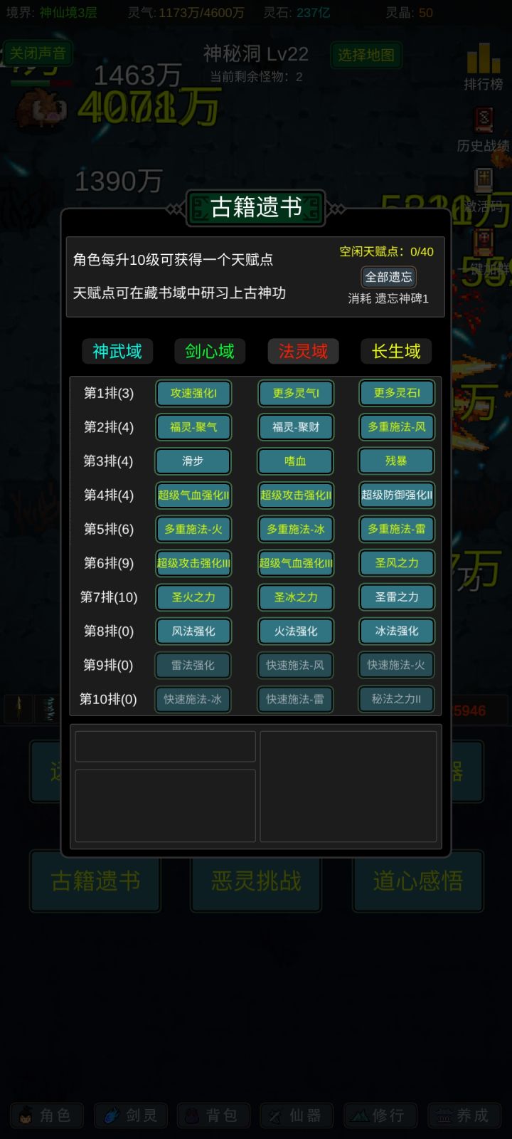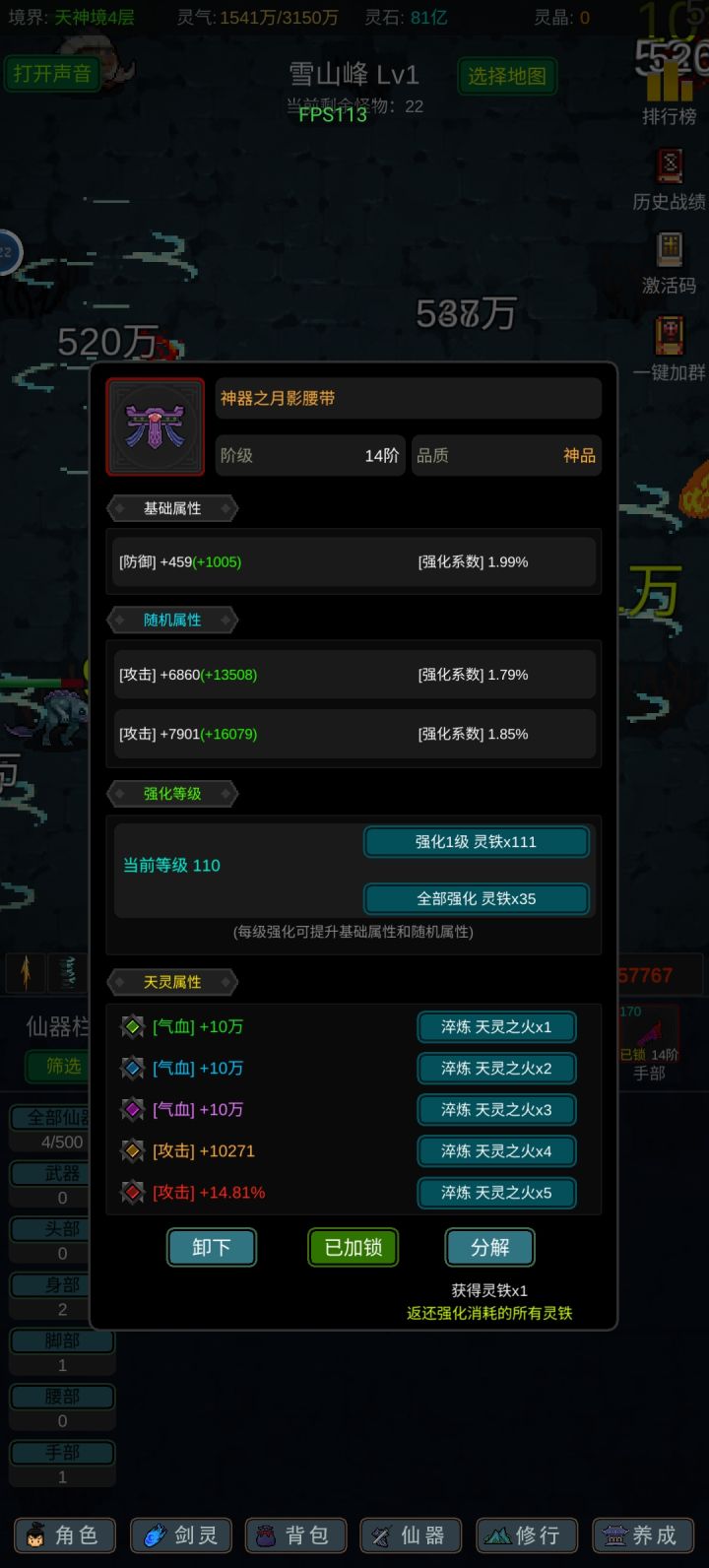 攻略应该有人写的七七八八了,我就不一一细说了,游戏内容也不算多,前期坚定一点只能玩“法修”就问题不大!其他的剑修、体修都是大后期才玩得起来,不然别说14阶,13阶都够呛能过,加点的话可以参考,我是法体双修过度到600级左右再转回法修,装备的话好坏看强化系数和词条,目前只有攻击和血量比较实用,过13阶大概需要血量300-400w,150w左右的攻击力,气运不同浮动很大,参考就好,等我过了14阶再回来