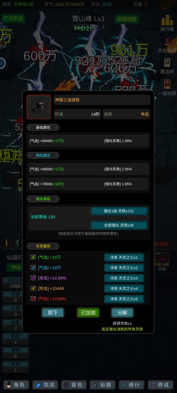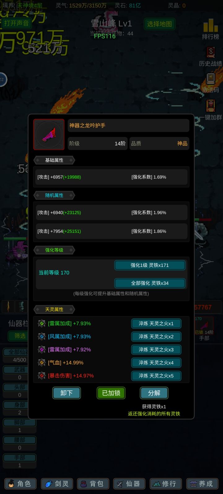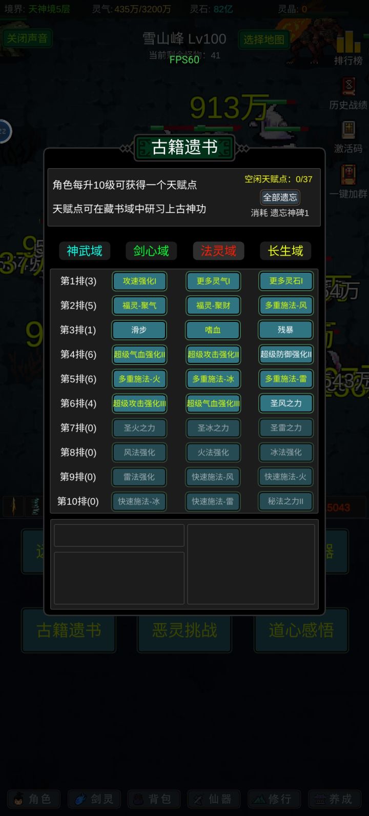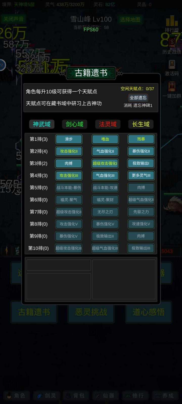 攻略应该有人写的七七八八了,我就不一一细说了,游戏内容也不算多,前期坚定一点只能玩“法修”就问题不大!其他的剑修、体修都是大后期才玩得起来,不然别说14阶,13阶都够呛能过,加点的话可以参考,我是法体双修过度到600级左右再转回法修,装备的话好坏看强化系数和词条,目前只有攻击和血量比较实用,过13阶大概需要血量300-400w,150w左右的攻击力,气运不同浮动很大,参考就好,等我过了14阶再回来
