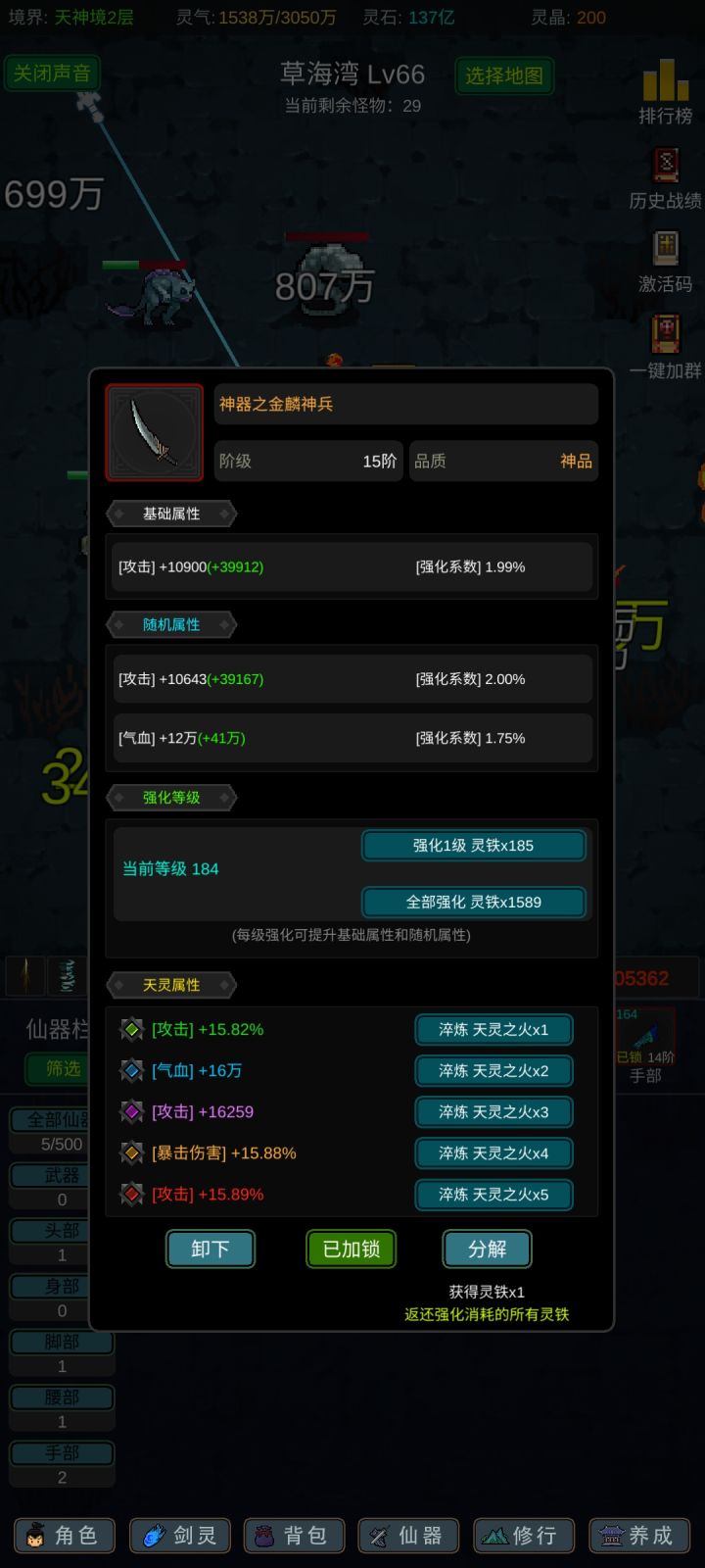 开局换兑换码和看广告,灵晶买天机令抽奖,刷完气运后把技能和神器都解锁和升级。看你想玩的流派洗气运,想快速升级的就洗聚灵,法修:大力,法术之心,快速咒语,仙尊转世,武圣之资,聚灵之心。(武圣或聚灵可以换暴击率,不要洗普攻,攻速,防御,灵石,属性加成这几个就行了),洗完气运开始挂机过图。前期不要用天火洗装备,刷好气运一般来说每一阶恶灵挂一会装备然后强化一下差不多就能过了,到13阶装备以上再洗词条,
