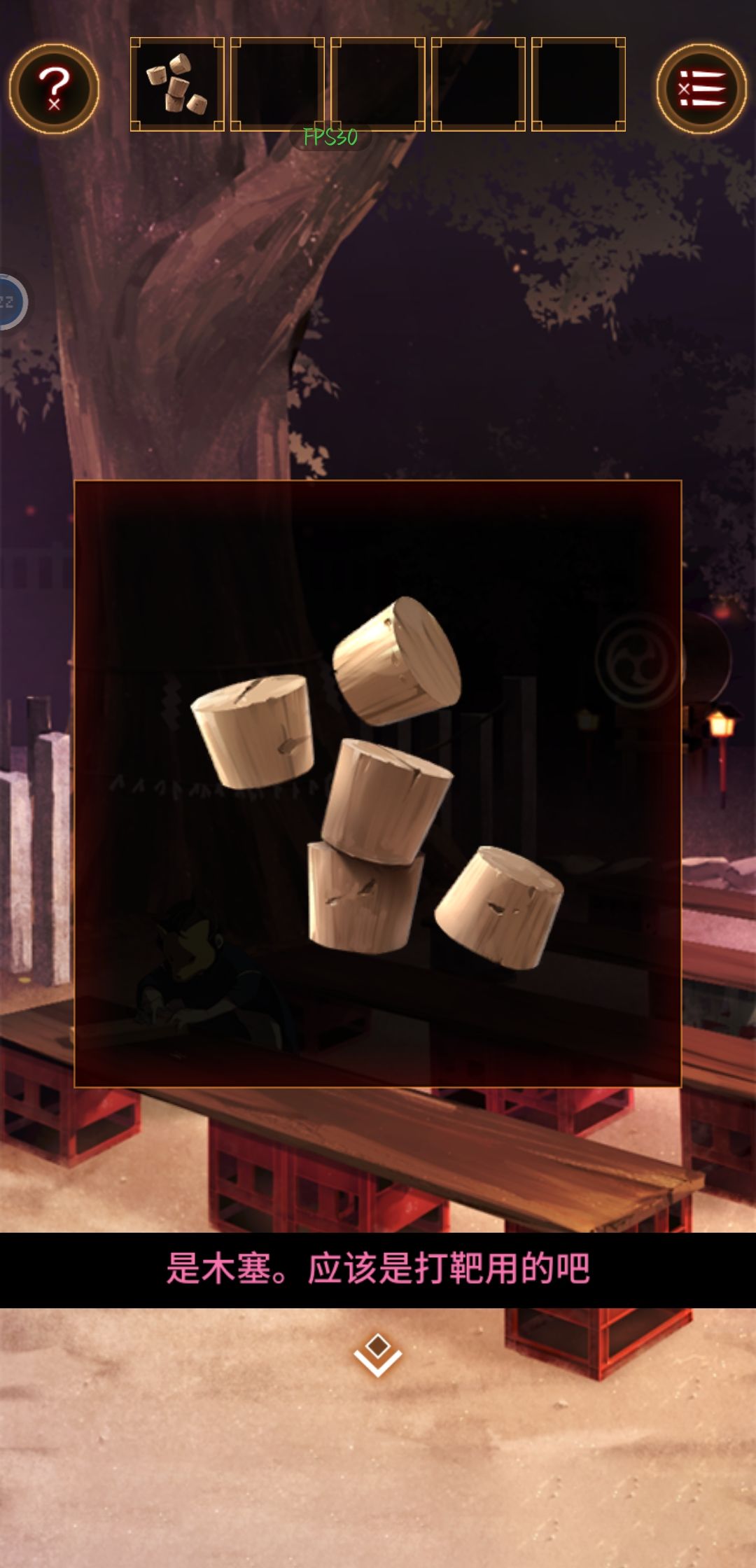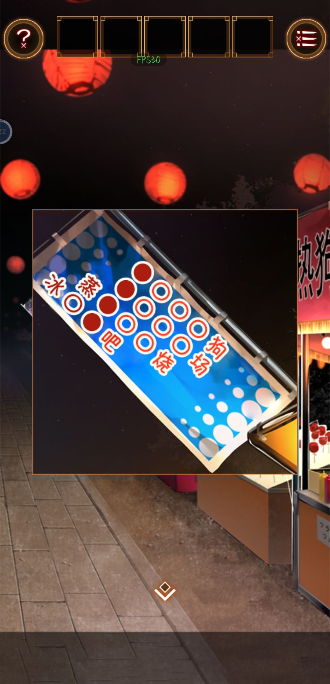 第五关 与带狐狸面具的男孩对话,获得木塞。 离开再返回,获得桌上的电池。 与大人对话。 捡起泉边的金色手环,观察面具,人面指向狐面。面具摊上有同样的面具,观察面具发现射击摊位的摆放一致,看面具视线得到线索。 点击射击小摊,按顺序用小木塞射击奖品。 (1排4→2排4→2排3→1排2→2排1)得到小鸭玩具,给小鸭玩具装上电池。 点击射击摊位旁边的空摊位,放下金色手环和小鸭子。 获得面具碎片,通关。 #