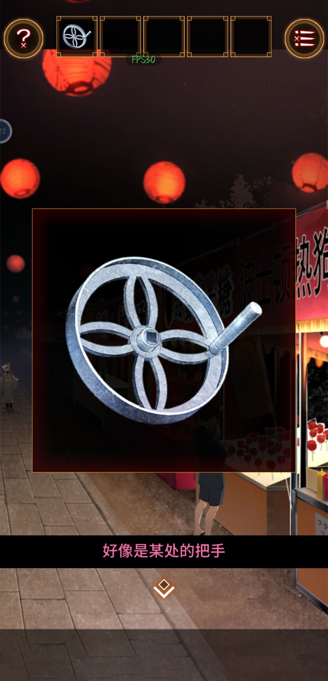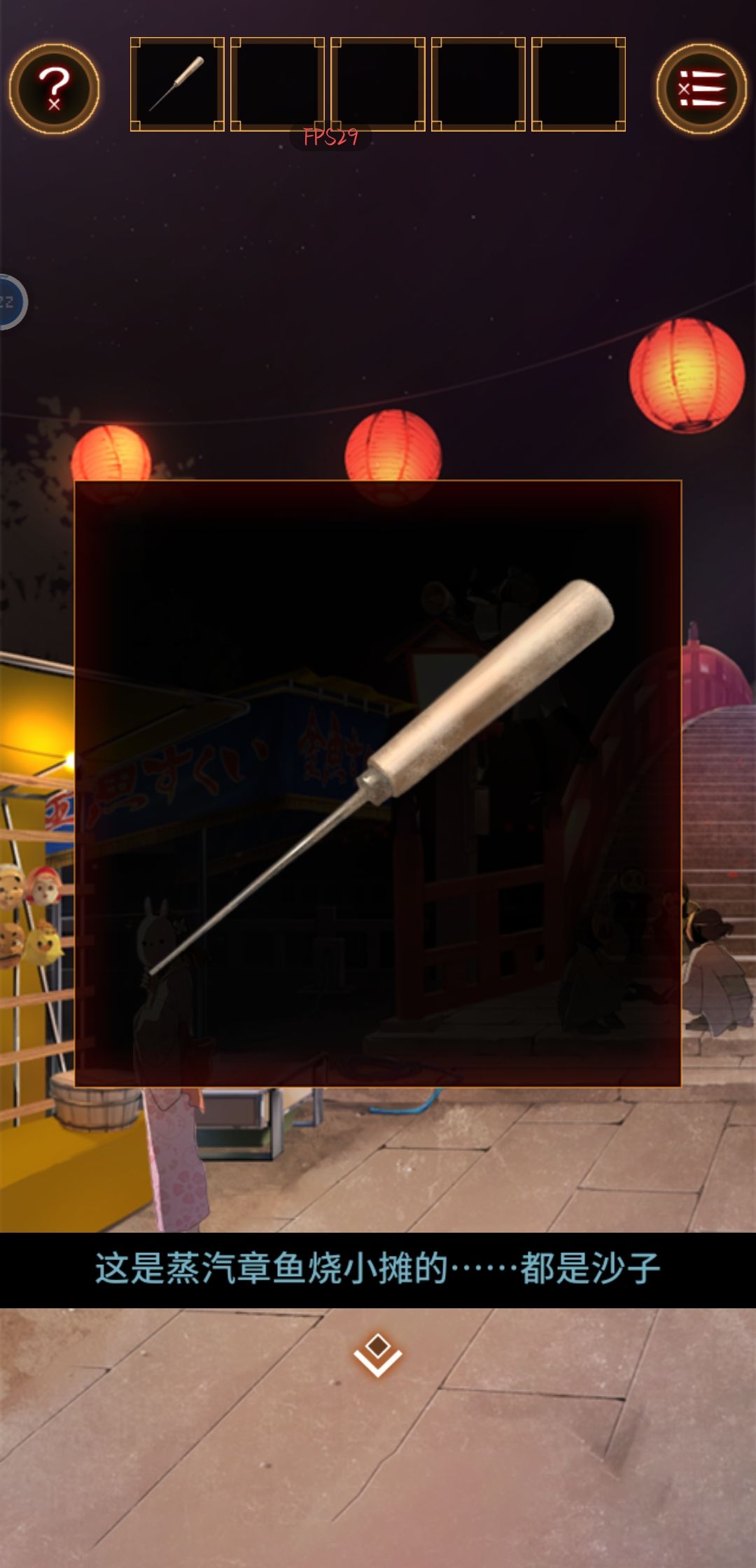 Chapter3(章节3) 1.(庙会-桥)点击金鱼摊,赶走金鱼,获得【钥匙链】 2.(鸟居前)点击面具人,触发剧情,拿【钥匙链】给他,获得【毛巾】 3.(庙会-桥)点击水管,使用【毛巾】,获得【湿毛巾】 4.(庙会-右)点击热狗摊的招牌,用【湿毛巾】擦掉上面的污渍 5.获得线索:大量色彩 6.(庙会-桥)点击木桶,根据招牌上的线索,调整密码锁:大量色彩 7.木桶打开,获得【水球】 8.(隐藏面具
