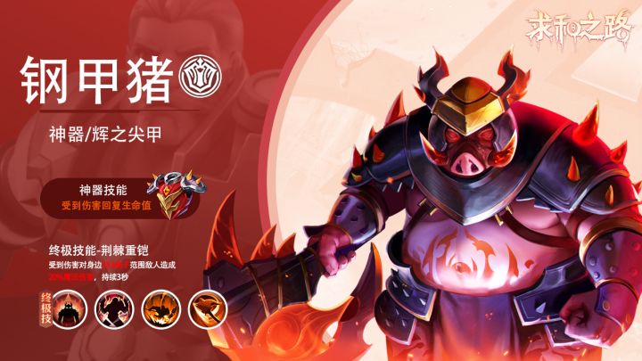 〖钢甲猪〗当前版本第一T, 法坦,兼顾肉,回血,范围伤害,反伤于一体的强力坦克; 缺陷:需要高练度,算是中氪以上的强势英雄。◈技能介绍◈普通技能——荆棘重铠技能效果:展开铠甲时,每被攻击一次,对身边3×3格内敌人造成20%法术强度伤害,持续3秒。神器技能——辉之尖甲技能效果:(1级)技能生效时,每收到7次伤害,回复自身生命值上限5%的生命值。(2级)技能生效时,每收到4次伤害,回复