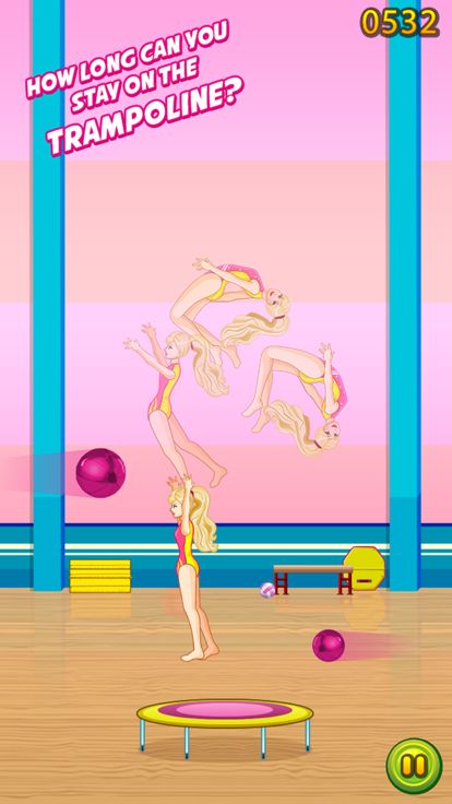 点击屏幕控制芭比公主躲避障碍物,芭比公主能在蹦床上多久? 看你的咯!