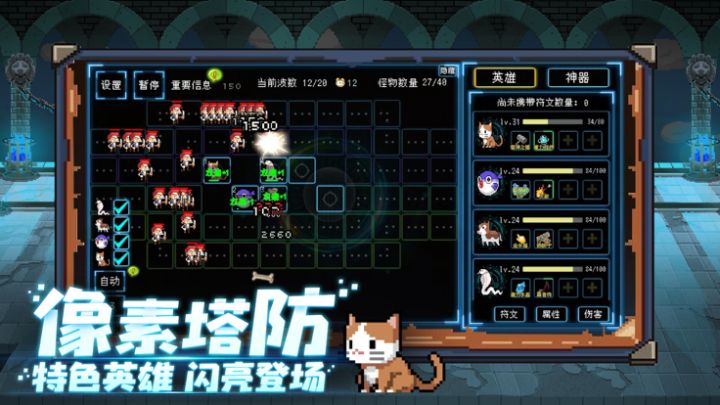 选择不同的神器符文增强英雄属性。不断击败敌人!获取碎片升级英雄,赢得最后的胜利!