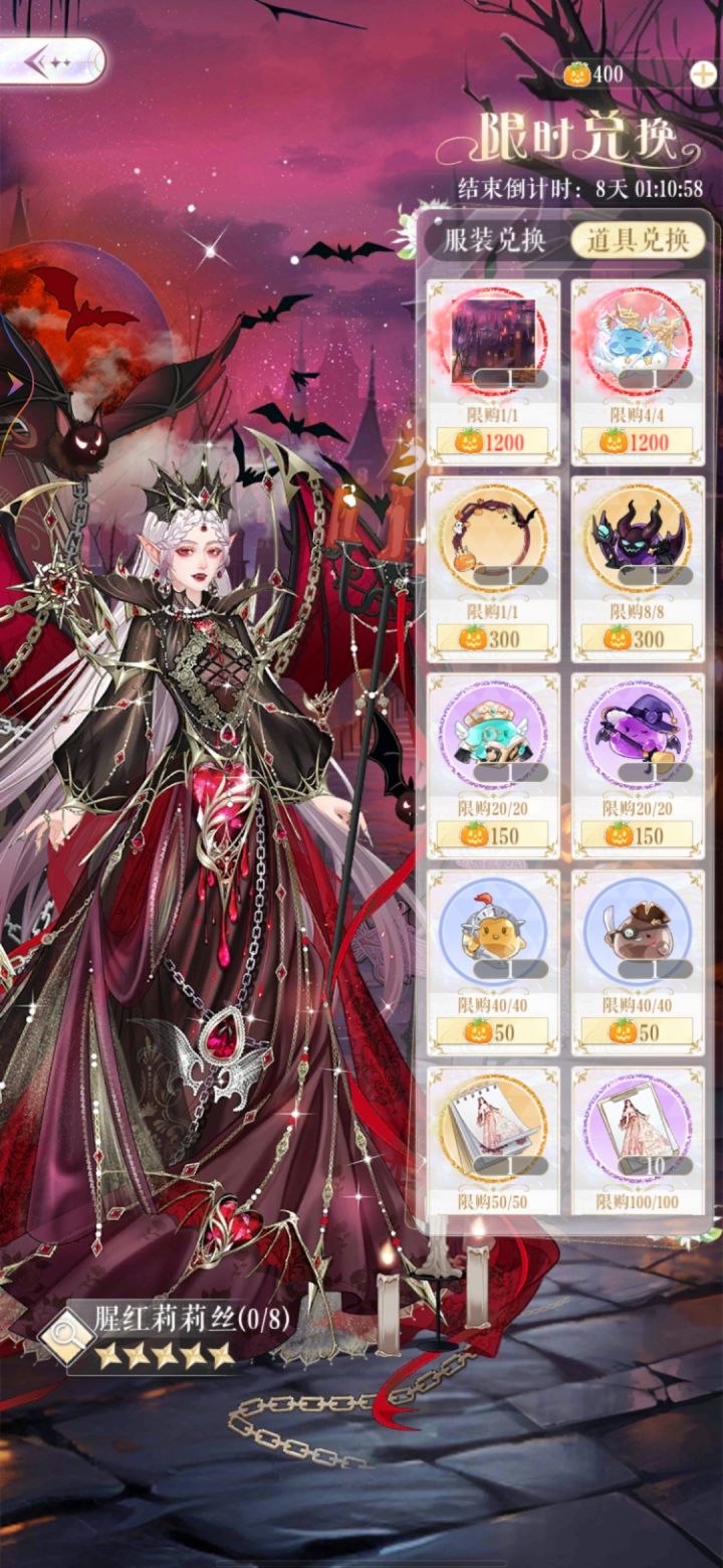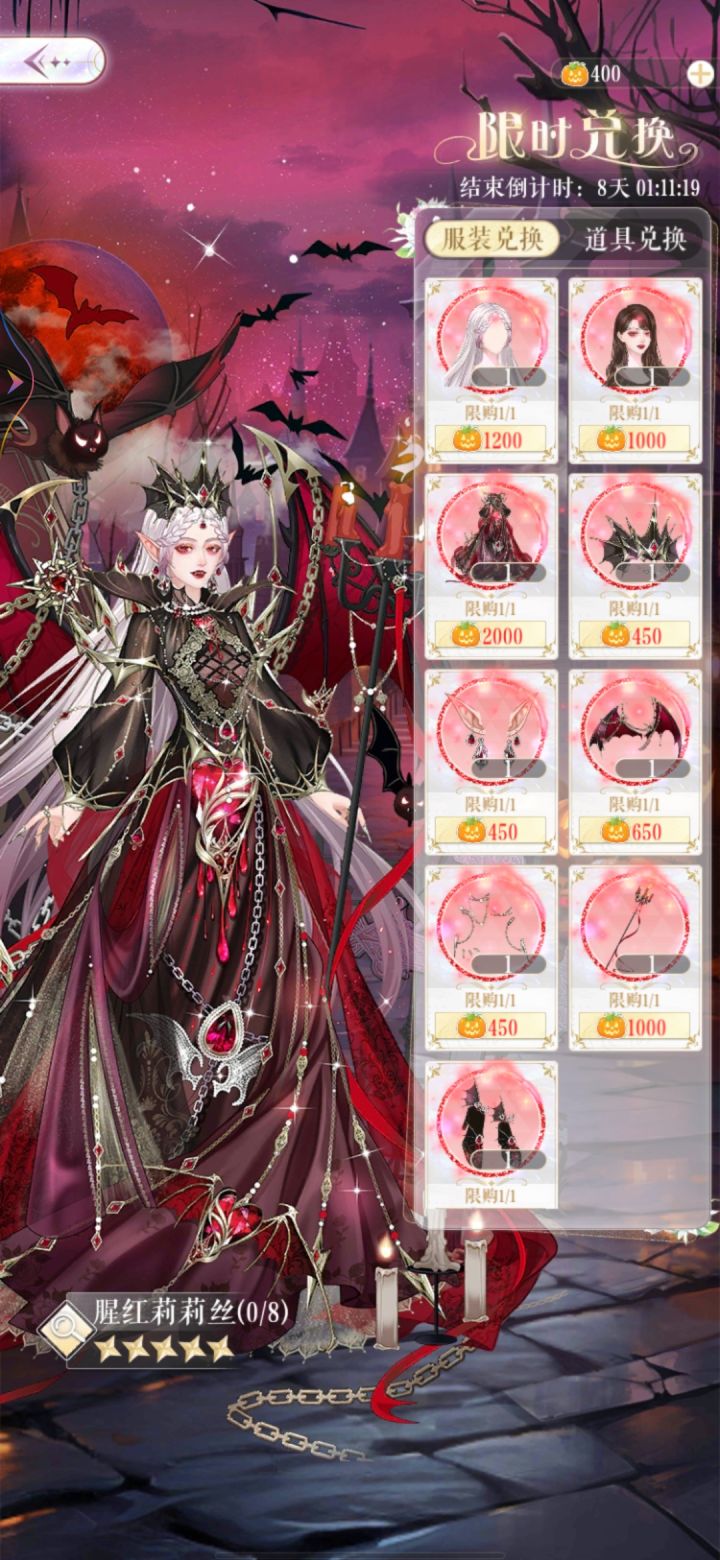 甜甜的你又名我的灵宠是只猫五星腥红莉莉丝,部件9,属性性感,贵族,魔幻四星50r累冲80r妆容魔幻绮夜,属性华丽,魔幻 时尚三星签到妙手甜心,属性性感,制服,魔幻(最下方省流)限时10天,日免可获得万圣礼炮,增加狂欢巡游进度条,获得南瓜灯,兑换物品使用货币均为南瓜灯 腥红莉莉丝服装套7000南瓜灯,妆容1000,背景1200南瓜灯,全部拿满9200南瓜灯,不拿妆容猩红莉莉丝依然是套装