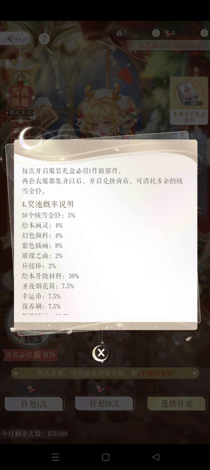 30个铃铛可以开启一次礼盒获得部件用袜子可以进行抽奖,奖池里面有概率获得若干道具和30铃铛一套需要300个铃铛,两套600第三十抽保底必得30铃铛,也就是30抽有60个铃铛运气好可以提前出好多铃铛此次活动欧非差距巨大,可以先氪两个30礼包进行抽奖后根据缺少的补足🌟只用钻是拿不齐套装的!