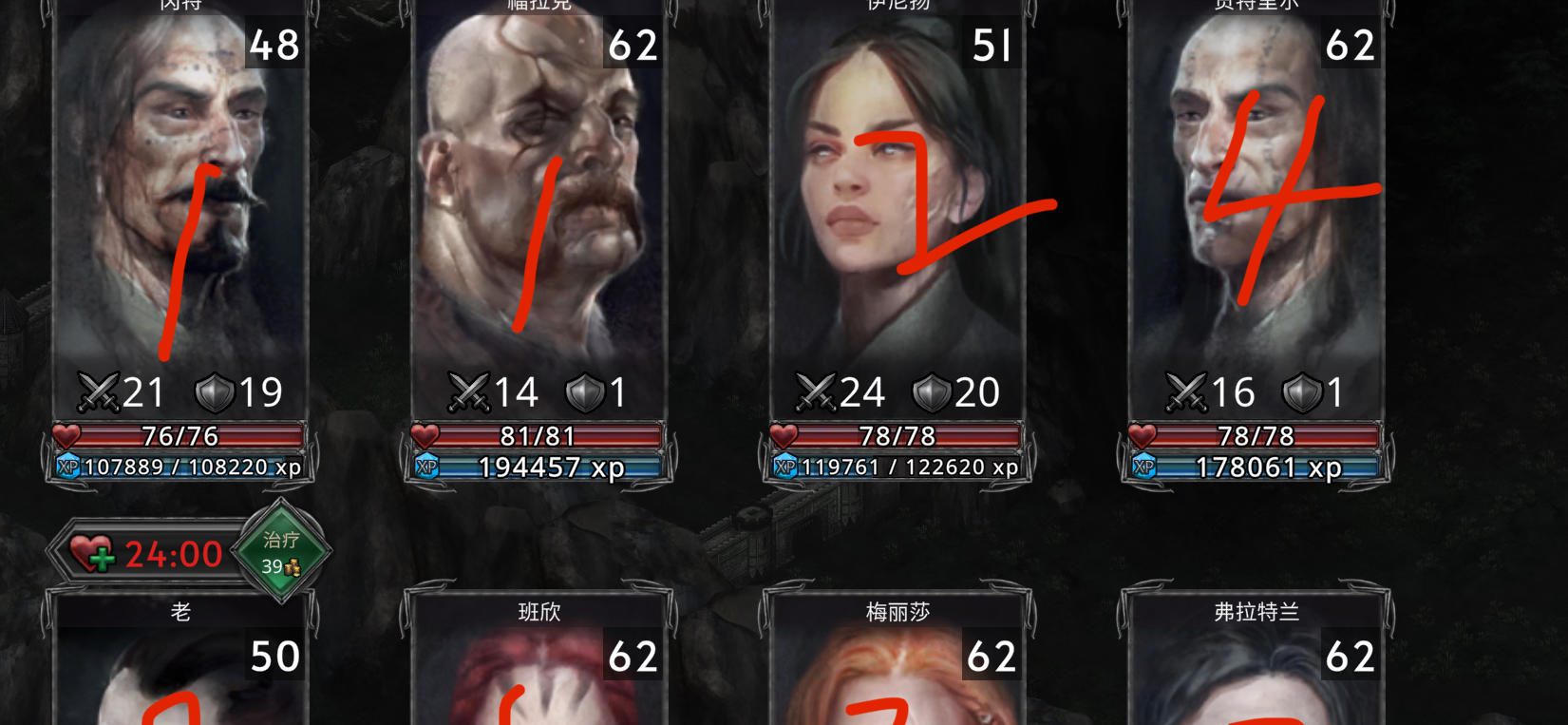 刚打完一周目回来给大家避避坑 有不对的告诉我 我改一下第一件事就是,酒馆英雄可以重开游戏刷新!!不要随便招募英雄!!一定要优先招募到核心主力英雄,因为所有怪只能打一次!只有营地附近偶尔会刷三种难度的怪能拿经验,先招募就能先吃到经验最大化!!英雄先招“冈特”和“福拉克”15级带的粉碎被动5%对全体敌人造成伤害,不必多说,打中一次顶你一轮输出,顶级英雄!!(见图一)不要买狼母!两被动都需要一个人