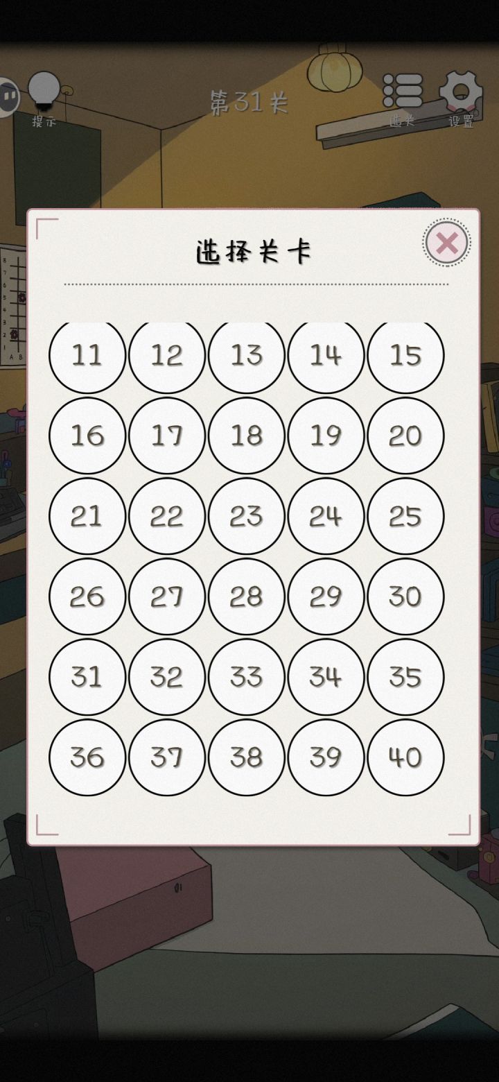 通关了,属于纯解密,比较适合于喜欢纯解密不敢玩恐怖的玩家,每关差不多两个谜题最后输密码开门,目标性很明显,没有无用干扰项,大部分属于仔细观察再思考就能解出来,个人感觉,除了有几个不太好想之外,其他大部分还蛮简单,如果就想玩不太难的纯解密,还是推荐的,如果还有高要求例如剧情,高难度,恐怖,那么不推荐。虽然有40关,但是感觉由于每关内容较少,游戏时长不会很长。总结一下,想放放松解密的,推荐。