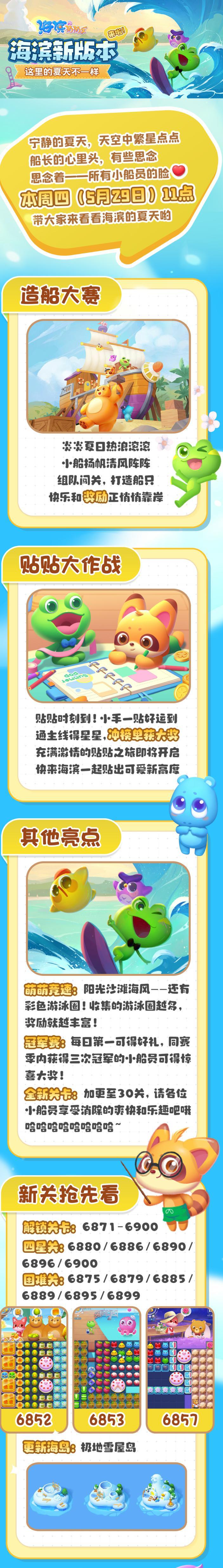 亲爱的小船员们 火热的7月就要到来 属于7月的全新版本也来啦! 快艇大赛闪亮登场 一同出海,清凉一夏! 更多精彩内容一睹为快👇 当然,别忘了还有更新福利哦 本周新关 更新时间:6月29日 解锁关卡:4801-4820 四星关:4811/4814/4817/4820 难关:4803/4807/4810/4813/4816/4819 超多有趣好玩的新关等你来挑战!#游戏资讯