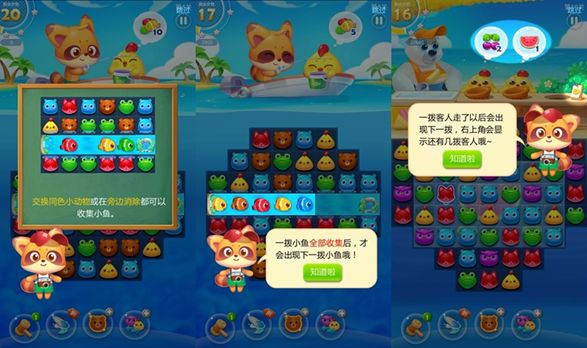 《海滨消消乐》是轻松休闲的三消游戏,是开心消消乐的姐妹篇,游戏画面十分清新亮丽,Q萌可爱的角色,璀璨夺目的消除效果等,再加上经典的三消换位操作,给玩家带来一次充满激情的消除体验!游戏还加入了自己的创新元素,例如收集水果、金鱼等等,更重要的是加入了很多道具,玩家可以使用这些道具帮助自己更加快速的通关。一、游戏初体验1、游戏剧情游戏开始就为我们介绍了游戏既有的剧情:我们的主角是小浣熊和他们的小