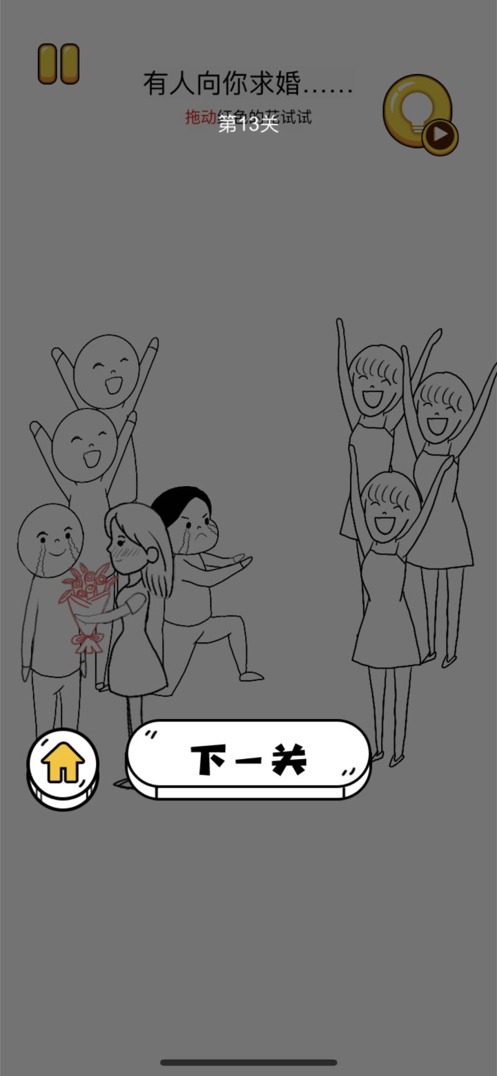 先把花拖到中间的女生手上,看到动作变了以后再把花拖到左下角那个男生手上