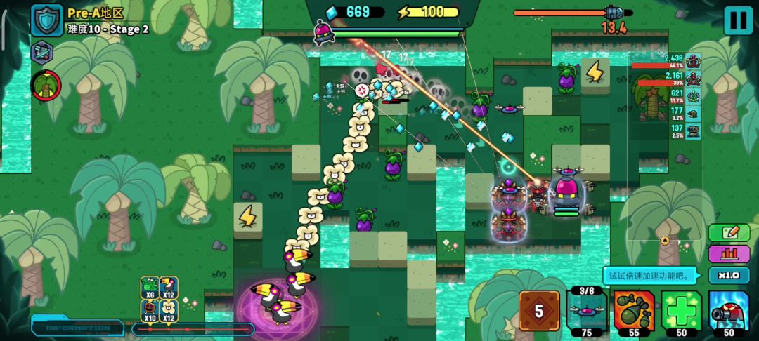 我现在打到5-5,前面的关卡HARD模式基本都能轻松的三星,从现在的威力来看至少后面很多图都能继续用这个方法推。 核心就是水晶塔,好像lv13就解锁了。这个塔自动外圈攻击,攻击力不高但是可以禁疗,穿透也不错。 塔的部件我现在只能买3级的部件,用的1个减速20,1个延迟减少35射程减少25。 开局你就根据地图设计一条让怪绕最远的线路,把几个岔路口节点用水晶塔堵上,再慢慢把沿线的输出点补上水晶塔即可,