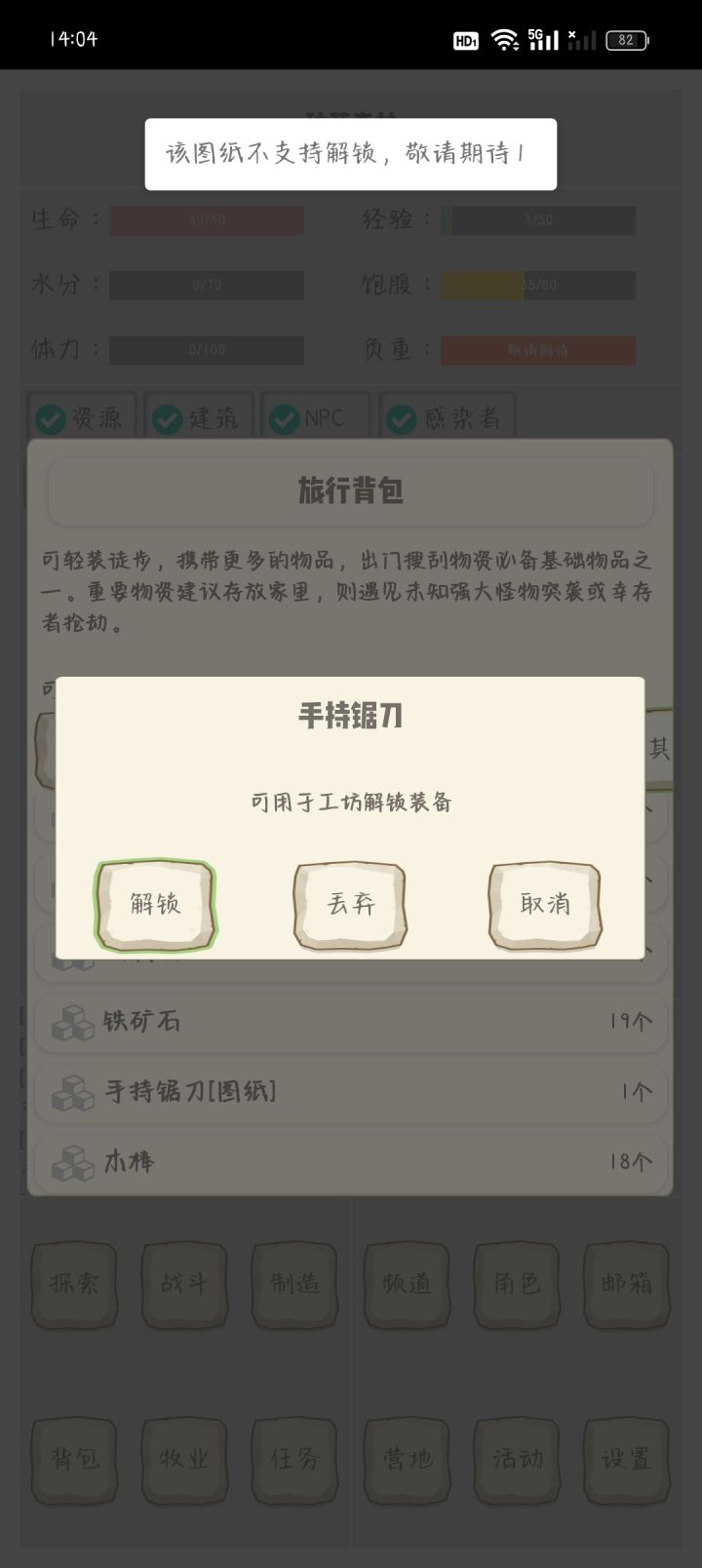 玩了十多分钟,随便讲讲吧,不能手搓背包,光靠自带的15个格子不太够用,然后仓库也有bug,目前发现的是简易绷带被吞,然后无法大量选取入库或取出,只能一个个的来,很让人烦躁,然后就是体力不能大量回复,只能靠吃喝来获取那少量的体力,可能你东西都吃完了体力都回不上来,这点很不合理,还有就是体力为0之后无法探索,需要一个床来回复百分比的体力(PS:有些手搓的物品上锁了,可能需要升等级才能解锁科技?反正我是