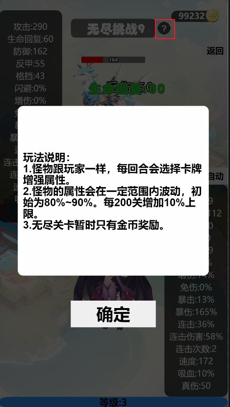 1.无尽模式: 1.1.怪物跟玩家一样,每回合会选择卡牌增强属性。 1.2.怪物的属性会在一定范围内波动,初始为80%~90%。每200关增加10%上限。 1.3.无尽关卡暂时只有金币奖励。 2.斗兽场: 2.1.解锁条件&入口:通关难度10后,点击主界面右侧【斗兽场】按钮进入 2.2.观察双方的属性值,选择你觉得能赢的一方进行投票。 2.3.投票后可以给自己的角色选择一张潜能卡牌