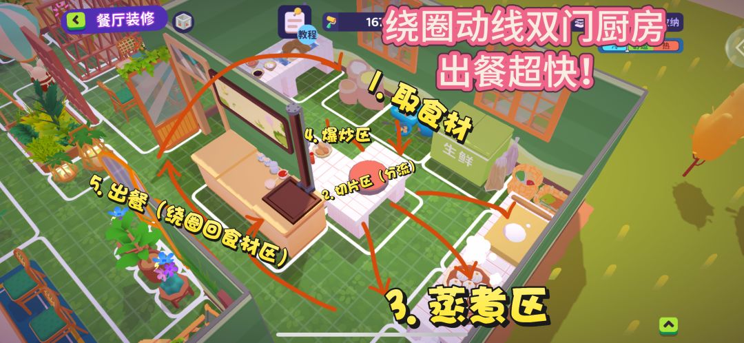 超级用心的设计😭熬夜观察厨师们做饭规律想出来的! ✅因为每一步必须要切,所以切完后分流去蒸煮区和爆炒区,能马上兜出去出餐,再兜回材料区取食材搞下一道!👀看图片超强动线!!绕一圈出一餐刚刚好! 😍妈妈再也不用担心我出餐慢了!! ✅公共区域四通八达,厕所远离饮食区,走廊革除臭味,最重要是0氪金,很有参考性!很多小伙伴已经抄作业啦~ ✅精打细算每个区域,保证美观同时,有最大容量的座位安排! 门口也不用