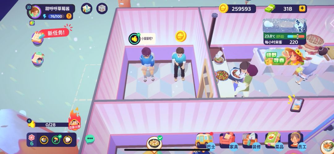 #新游攻略局vol1 目前卡5星餐厅的菜谱改良1.开局跟着主线任务走(也就是会给人物升级经验的)。 2.如果主线卡了想办法达到主线的要求,但是不要一昧地做外卖和宴会,这两个会根据你餐厅的星级提升而提升奖励,而且这俩刷新时间不会增加,如果你是3星餐厅那就只做3级任务,低的统统刷掉。 3.如果18级开了农场,农场订单的刷新时间会随着刷新次数增加而增加,但是前期我们作物本来就不多,所以推荐多刷刷争取做