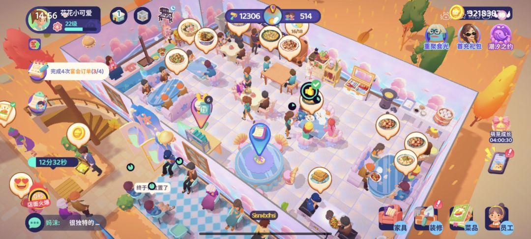 #新游试玩节 - 快速服务客人:前期亲自招待客人,关注客人头顶气泡,按点单、制作、收钱、清理的流程服务。积累一定口碑后,招聘服务员和厨师提高效率。 - 合理安排员工:根据员工的技能和属性,合理分配工作岗位,提高工作效率和服务质量。 - 关注顾客需求:不同客人有不同口味偏好,尽量满足客人需求,提高顾客满意度和忠诚度。 扩地装修 - 及时扩地:看到餐厅旁边有可扩地区域,点击进行扩地,扩大餐厅面