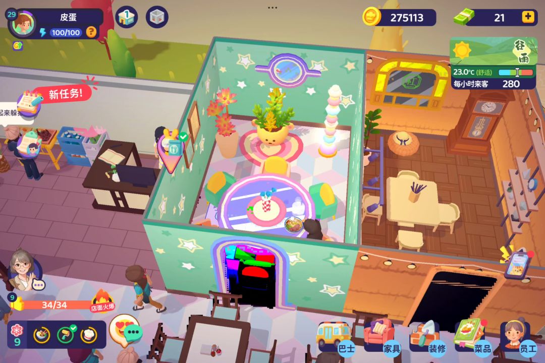 装修小tips :🍀关于厕所的门,我安在左边墙上了,门不能正对着用餐的客人,也要保护上厕所人的隐私。🍀厨房大家可以加一圈隔断设计,弄成单独的区域也可以,我因为开的地太少暂时做成开放式。🍀像六人桌是圆桌,如果跟其他四人桌二人桌放在一起会有点乱,对强迫症很不友好,那么我们可以设计成包间~一个包间放一张六人桌,方便家人聚会,同学聚餐~ #新游攻略局vol1 #百味食光 #百味食光攻略 #游戏百味食光 #