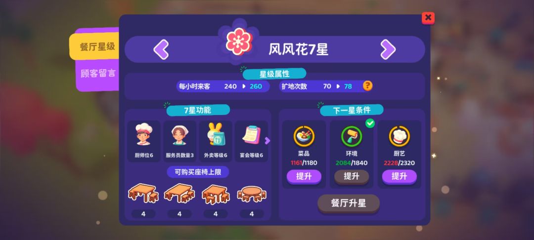 升星就3个条件:1、菜品 2、环境 3、厨艺 1、提升菜品-做外卖订单拿秘籍 (用适合菜系厨师额外奖励一定要拿!)[表情_+1] 还可以去杂货店,直接用海风币购买 改良菜谱(最优先,不然客人会给差评)[表情_嫌弃] 2、提升环境-心愿家居抽卡+给餐厅家居换外观 3、提升厨艺-店长直聘抽厨师-给厨师升级升星(升星卡牌不够就看碎片能不能凑几个) *前期会缺鸡肉,升级厨具优先提升冰箱 ,去小镇把蔬菜水产