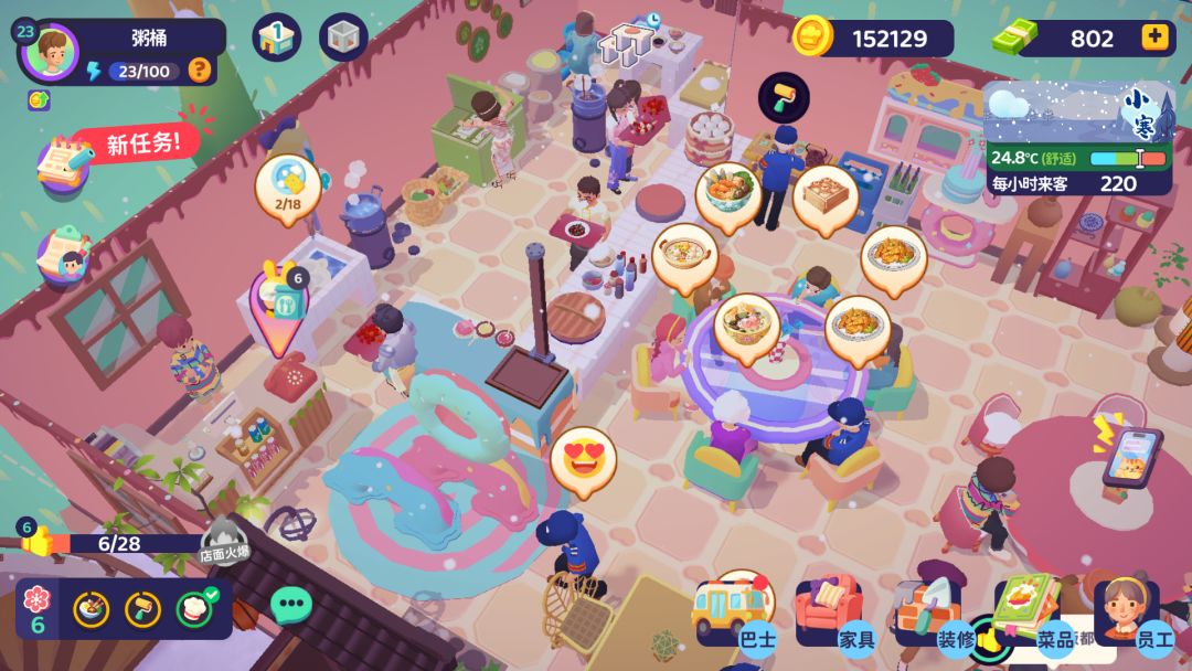 #新游试玩节 - 快速服务客人:前期亲自招待客人,关注客人头顶气泡,按点单、制作、收钱、清理的流程服务。积累一定口碑后,招聘服务员和厨师提高效率。 - 合理安排员工:根据员工的技能和属性,合理分配工作岗位,提高工作效率和服务质量。 - 关注顾客需求:不同客人有不同口味偏好,尽量满足客人需求,提高顾客满意度和忠诚度。 扩地装修 - 及时扩地:看到餐厅旁边有可扩地区域,点击进行扩地,扩大餐厅面