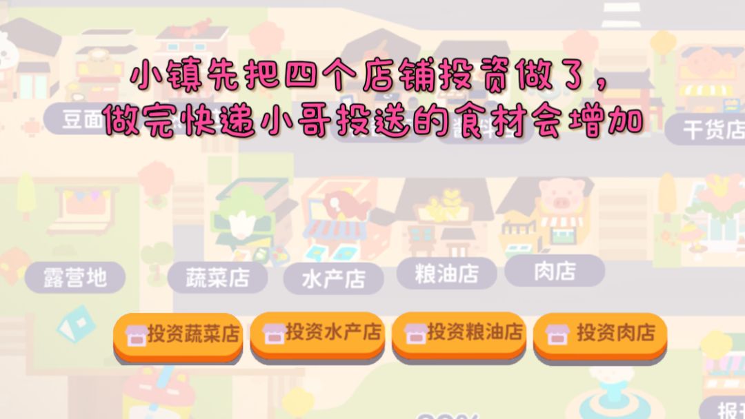 1.进小镇先把四个店铺投资做了,做完快递小哥投送的食材会增加; 2.存储家具和烹饪家具都可以升级,一个增加菜品一个增加存储,食材小哥只能配送到家具存储上限,不升级的话睡醒错过一个亿; 3.外卖和宴席一定要去做自己对应的最高等级; 4.选取的厨师和外卖需要的厨师对应不上,可以先把选取的厨师换成自己需要的菜系厨师,再去做外卖任务,做完换回来; 5.升级店铺的道具21级解锁小镇客人会给,升级地块的锯子卷