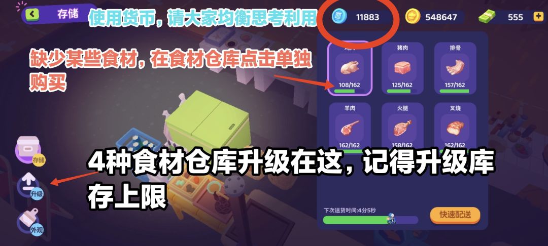 到目前所知道调料来源 1️⃣小镇里采集原料然后去百里香处加工,但一天可以采集的量有限(采完之后很久才刷新) 2️⃣外卖获取,一天能带回来24个调料 3️⃣餐车获取,一天10次,一次3原料 玩了几天我发现 1️⃣外卖订单很重要,里面有个额外奖励,派遣符合的厨师能带回来一个调料礼包。如果外卖订单和你的厨师不符,可以拒绝订单,5分钟后会刷新,相当于一天能有48个调料 2️⃣餐车,一天10次,如果不花额外