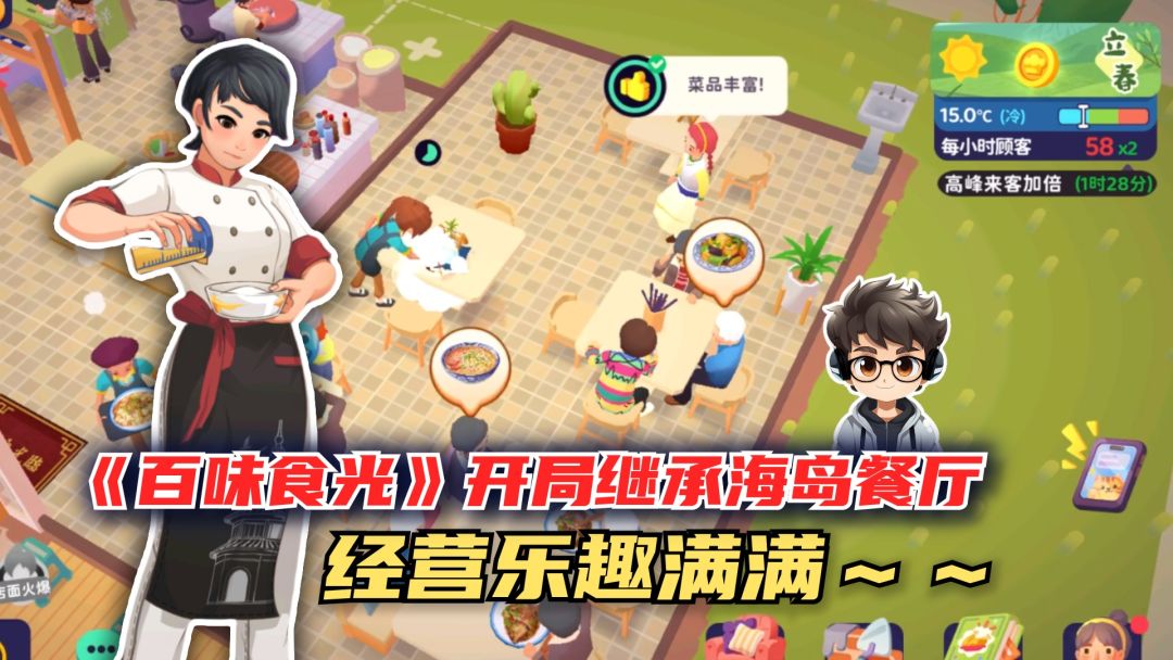 《百味食光》是一款轻松有趣的卡通风餐厅模拟经营手游,玩家将从接管一家位于海岛的神秘餐厅开始,开启自己的美食之旅! 在游戏中,你需要亲手打造梦想餐厅:从装修风格、菜品设计到员工招募,全都由你来决定。游戏亮点之一是独特的厨师招募系统,通过抽卡解锁不同菜系的顶级厨师,每位角色都萌趣十足,让餐厅运营更加生动有趣! 除了餐厅经营,游戏还融入了种菜、捕鱼、投资等玩法,逐步拓展你的产业链,打造从农场到餐桌的完美