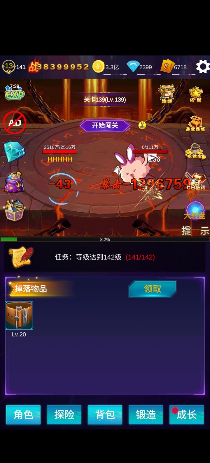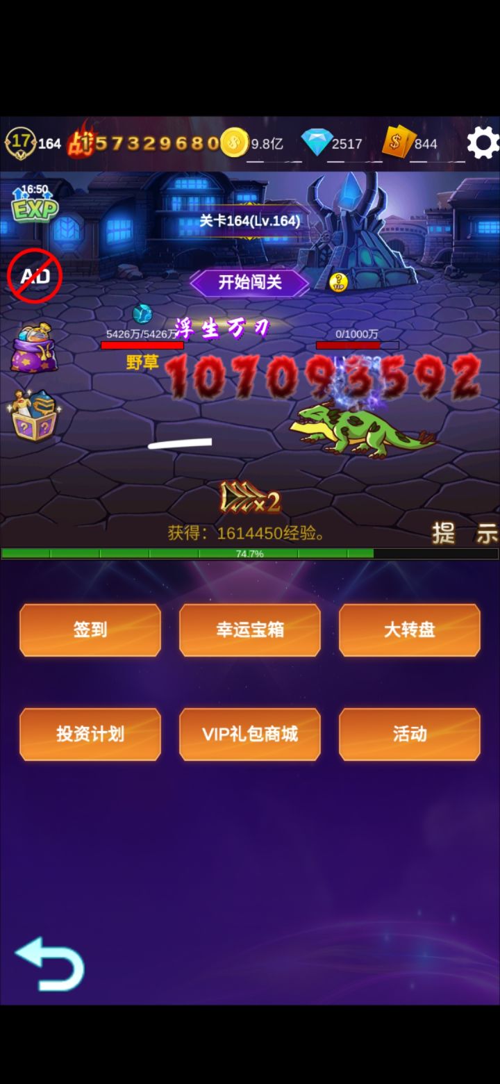 进入游戏①第一件事,把QQ群的礼包码全兑换了。taptap还有签到礼包。②点福利→vip礼包商城,把所有礼包买了。然后点成长→兑换,拉最下面180级后免费换1000代金券15000钻那个,留个2000卷这样做每日任务,多的全兑换了。就能v10起手经验加成超牛。③点福利大转盘,疯狂转起来!④点左上角exp经验,把广告看满,然后挑战关卡,有装备就装备上,中间那个开始闯关记得一直保持推到等级的最