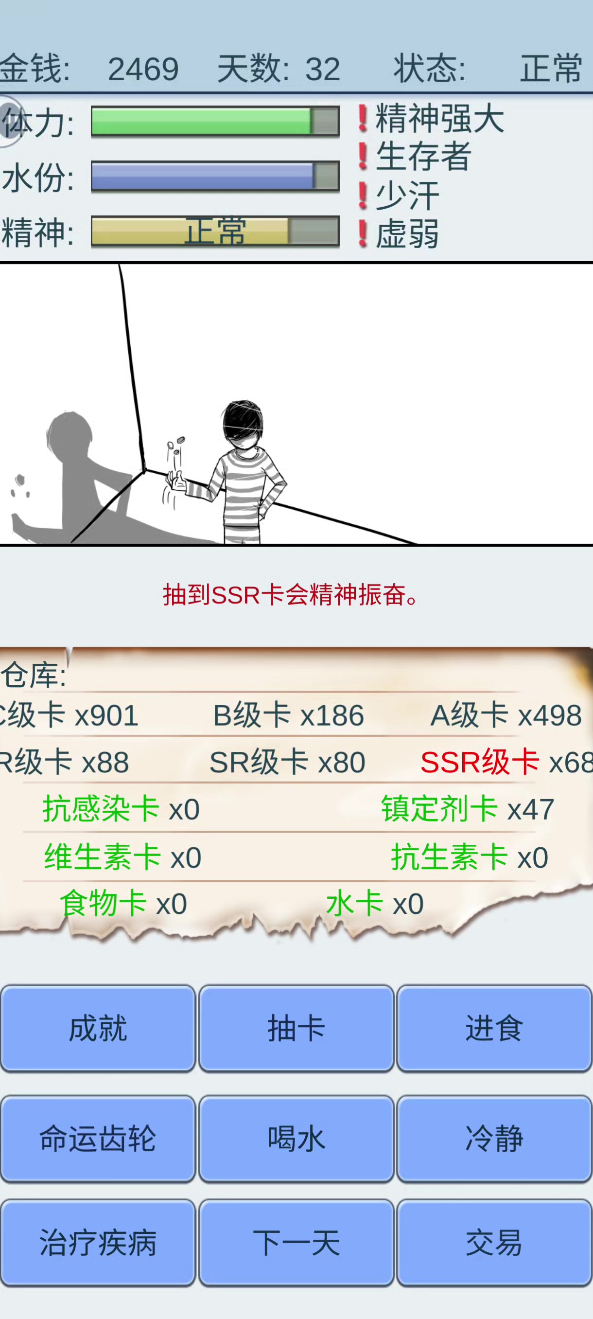 --抽卡人生如果天赋差,如何快速过回合,先过5天,接着一直抽奖,天赋好坏在下方抽卡是可以两个指头点的为了保证万一,疾病卡最好留2个交易时,如果疾病卡各持有一个,那么金钱全换食物,如果食物超过20个,可以考虑换镇定剂如果天赋好,最后吃饱喝足再抽卡当食物和水5级以上,同时交易里的食物和水售价之合至少80越高越好,食物水持有量高于20,同时有售卖镇定剂,就可以考虑回合循环了命运之沙升级,s