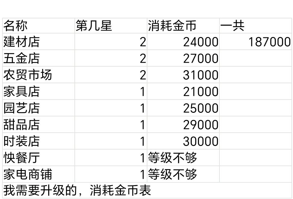 【★★★回复中有新版本★★★】手工统计并做了简单的评价分析,分析评级的规则抛开个人游戏在线时间和习惯,仅以原始数据做评判标准。但基于一致标准下,评级相对有个公平的准绳,仅供大家参考。手工统计,不喜勿喷!有统计错误请留言,感谢! 特别说明: 商店大部分在一星状态统计(因部分商品需要升级可见),所以制造用时也是10%的效果,累计用时加入一、二级材料的制作时间叠加。 因为萌新一枚,等级原因,数据不全,大