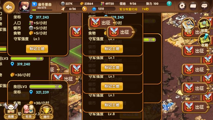 相当严重的一个问题哦,不过不算bug,只是游戏性会差一点ꉂ(ˊᗜˋ*)。世界出征点一块地查看土地属性,从而判断进攻哪块地好是很基本的游戏性。但却无法第一时间取消,几次尝试后发现必须点出征后跳出选人界面在退出才能取消土地属性,这样会很不方便的,更会出现像图中这种多块土地属性叠在一起的可怕现象,出于玩家的角度,希望能改进改进